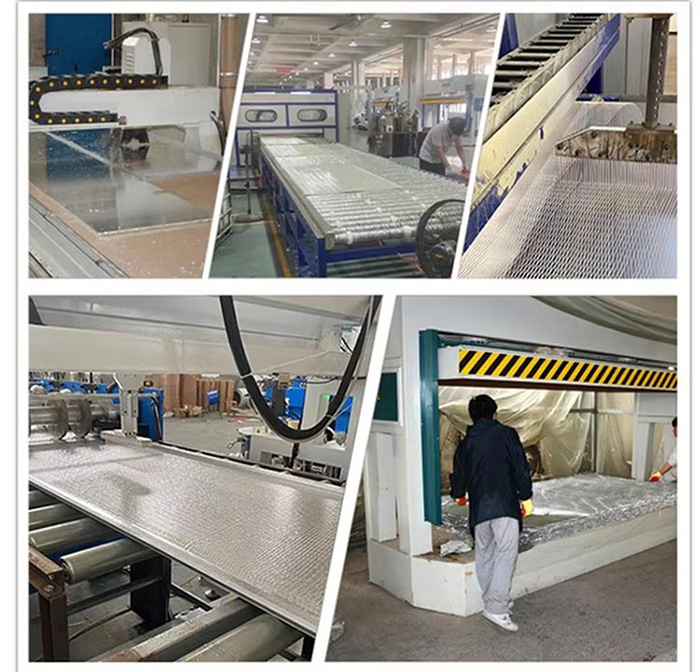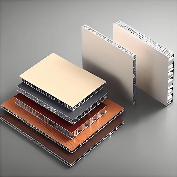 Aluminium honeycomb väggpanel är en sandwichstruktur, bestående av två lager aluminium och en bikakekärna. Panelen är huvudsakligen gjord av högkvalitativ 3003H24 legering aluminiumplatta eller 5052AH14 hög manganlegering aluminiumplatta som basmaterial, med en paneltjocklek på 0,8 ~ 1,5 mm och en bottenplatta tjocklek på 0,6 ~ 1,0 mm. Bikakekärnan är gjord av mycket tunn 3003 aluminiumfolie med en tjocklek på 0,04~0,06 mm och en sidolängd på 5~6 mm. Den har en hexagonal bikakehålsstruktur med hål kopplade till varandra. Hela bearbetningsprocessen slutförs i en modern fabrik med hjälp av varmpressningsteknik.