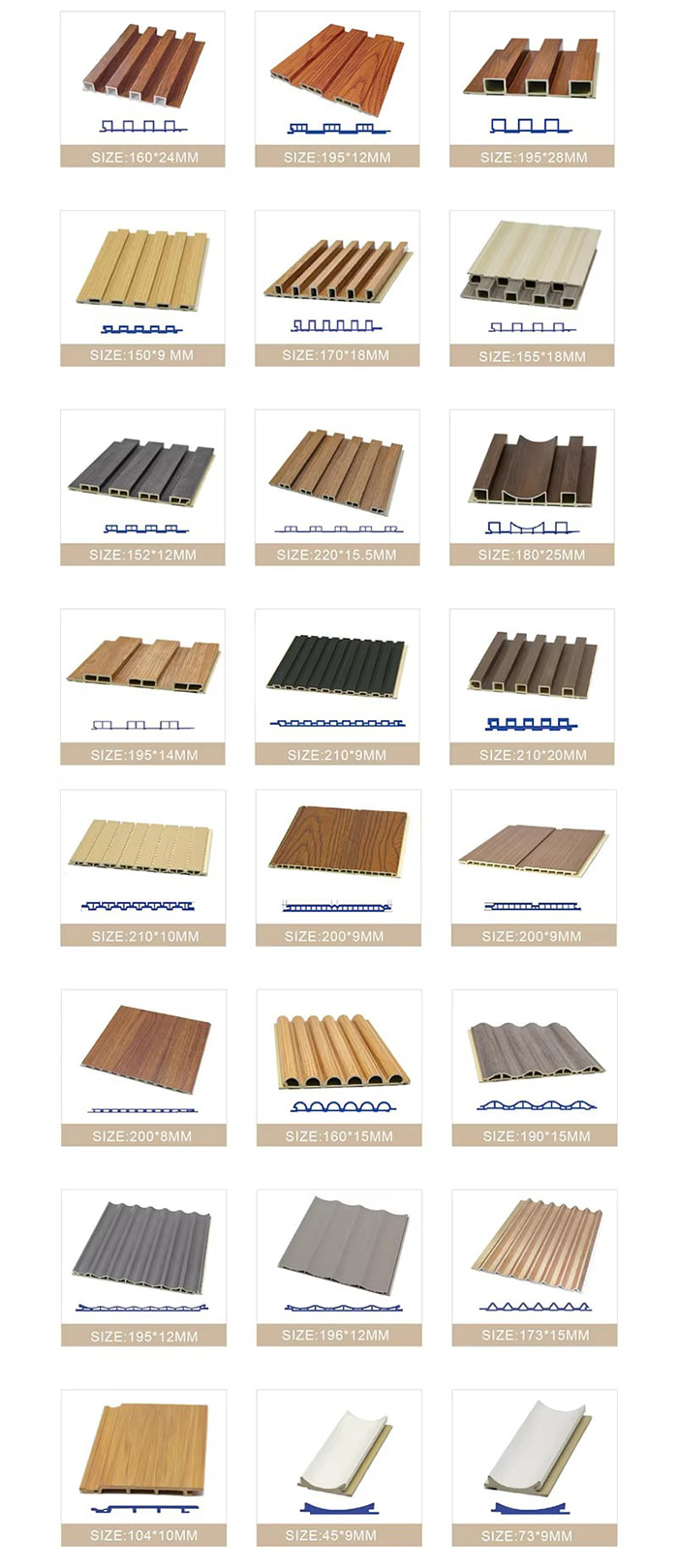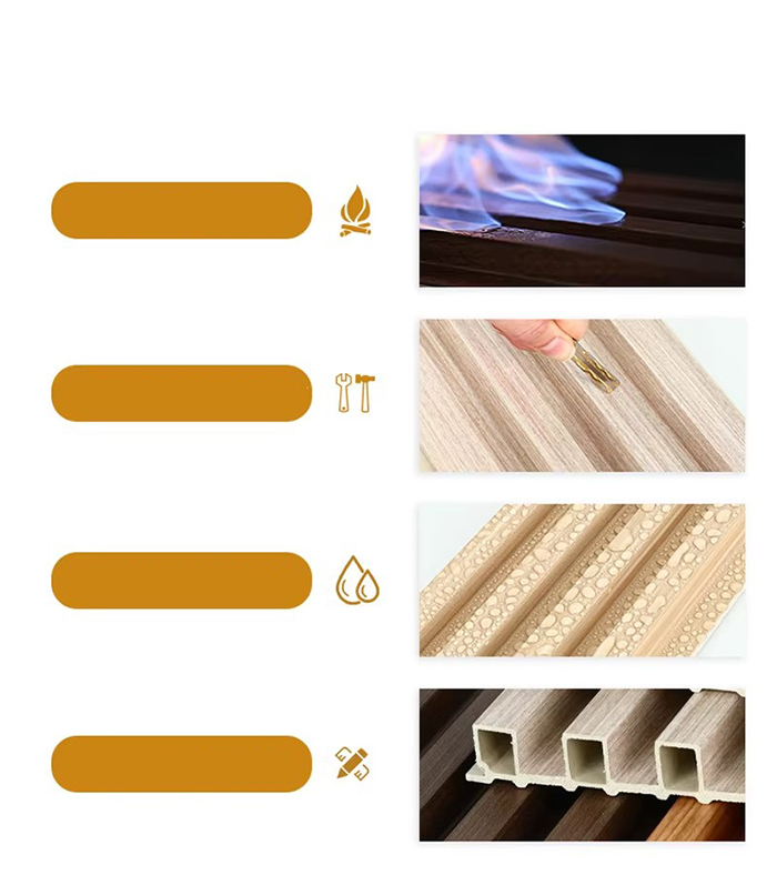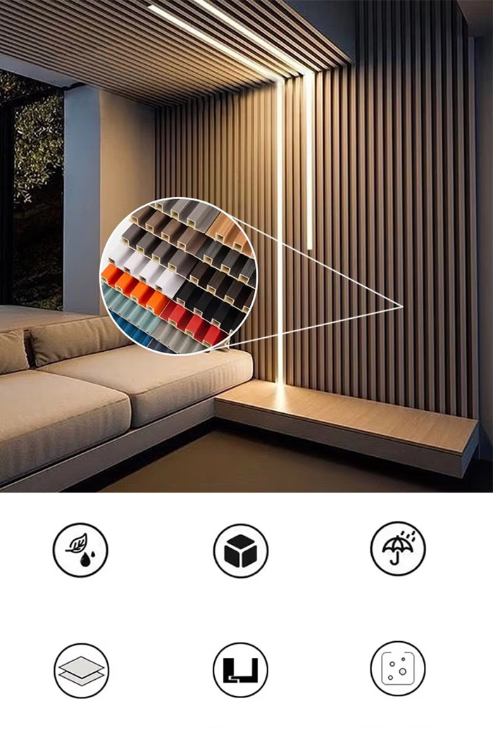 WPC inomhuspaneler är nya miljövänliga dekorativa paneler gjorda av träfiber eller bambufiber som kärnråvara, sammansatt med PVC-harts, kalciumkarbonatpulver och stabilisator genom högtemperatur- och högtrycksprocess. Ytan antar UV-beläggning eller högprecisionsöverföringsteknik för att simulera texturen av naturligt trä och sten, och har egenskaperna vattentät och fuktsäker, mögelbeständig och antibakteriell, lätt vikt och hög hållfasthet. Den är lämplig för inomhusväggar, tak, fondväggar och andra scener, och är ett idealiskt val för att ersätta traditionella träfaner och plastkilar.